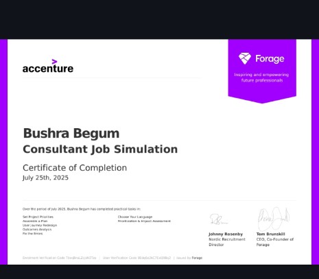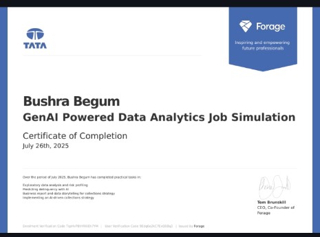 I am Bushra Begum, a recent BBA Management graduate specializing in Finance and HR. To further enhance my skill set, I have completed courses in Data Analytics and Data Science. Throughout my learning journey, I have worked on over six projects, creating interactive dashboards that translate data into actionable insights. I am passionate about combining management knowledge with data-driven techniques to solve real-world problems effectively.
