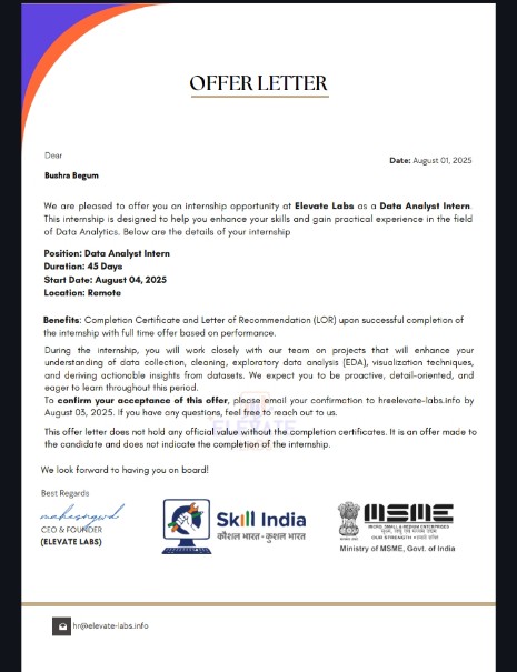 As a Data Analyst intern at Elevate Labs, you apply your strong foundation in data analytics to collect, process, and analyze complex datasets. You support the team by generating actionable insights through data visualization, statistical analysis, and reporting. Leveraging your certification and analytical skills, you contribute to improving business strategies and decision-making. Your role involves collaborating with cross-functional teams to ensure data accuracy and support ongoing projects, demonstrating a commitment to continuous learning and professional growth in data-driven environments.