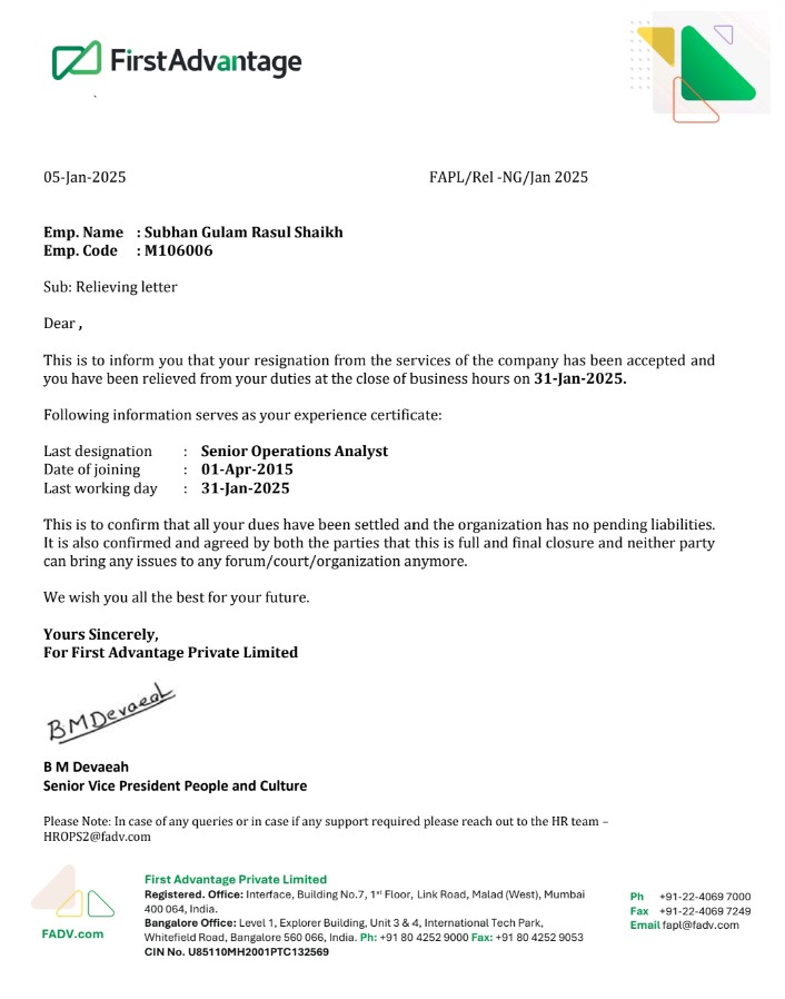 Expertise – Verification Industry (First Advantage Pvt. Ltd.) End-to-End Verification Process Management Back Office Operations & Documentation Data Analysis, MIS Reporting & Advanced MS Excel Quality Control & Compliance Monitoring Workflow Optimization & Process Improvement Client Coordination & Team Handling Expertise – RA Construction Pvt. Ltd. Contractor & Project Documentation Management Preparation of Invoices, Purchase Orders & Reports Record Keeping & File Management Coordination with Site Teams & Vendors Administrative & Back Office Support Ensuring Accuracy & Confidentiality of Records